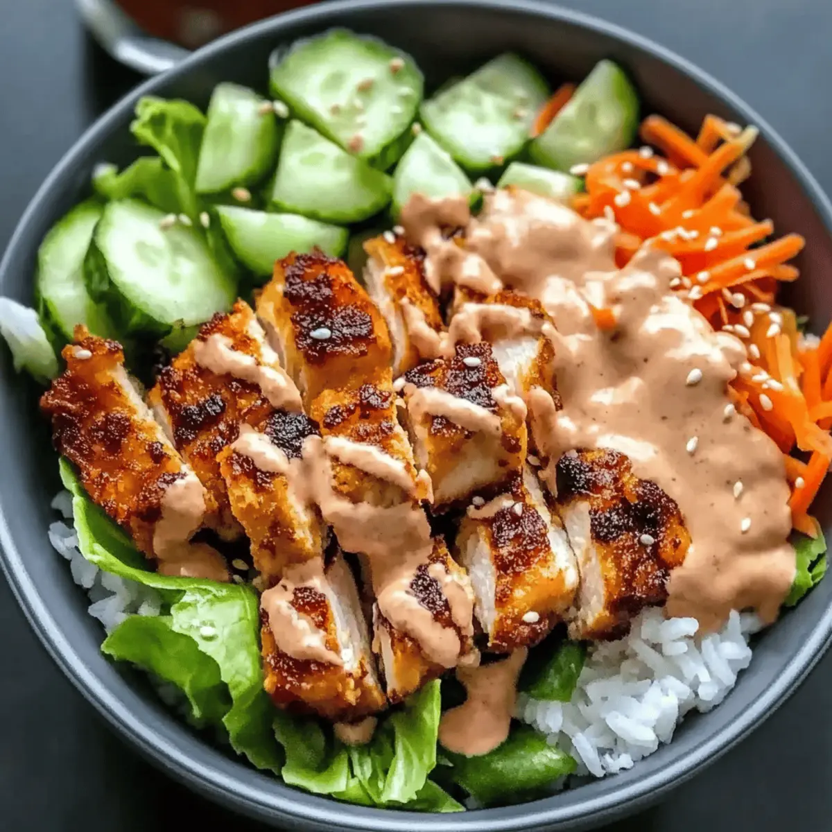 - Place jasmine rice at the bottom of the bowl. Layer with crispy chicken and top with lettuce, cucumber, carrots, and green onions.