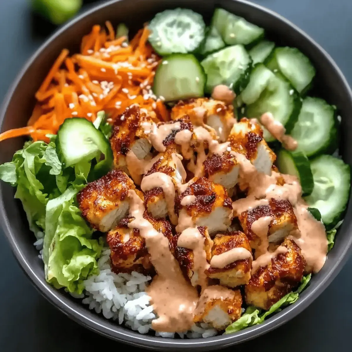 Flavor Explosion: This bowl boasts a bold combination of crispy chicken, fresh veggies, and a creamy spicy sauce that will tickle your taste buds.