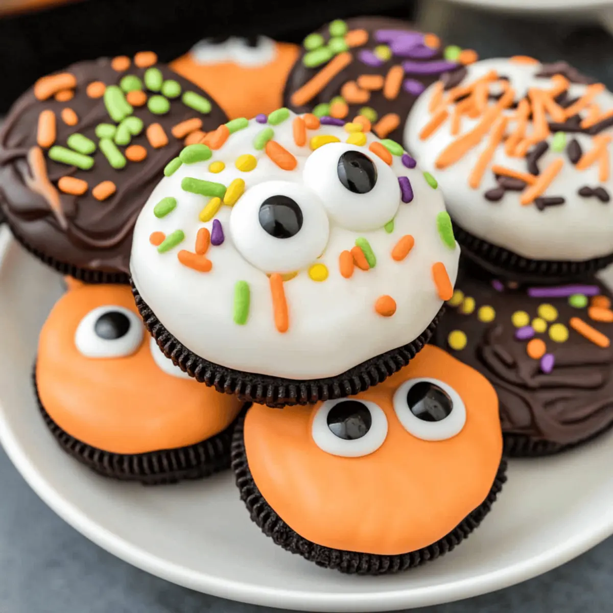 Place the dipped Oreo onto the lined cookie sheet promptly. While the melted candy is still soft, generously sprinkle with colorful sprinkles or attach candy eyes for a playful touch. This step allows for creativity, so have fun with the designs as you make these delightful Chocolate Covered Halloween Oreos perfect for any celebration.