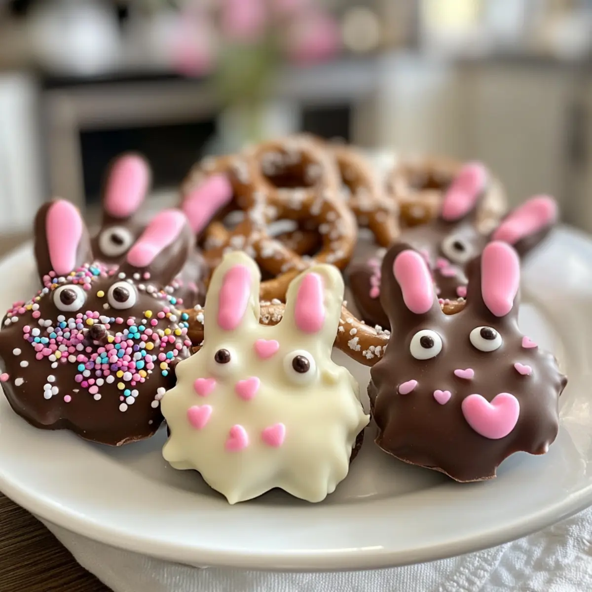 For the rabbit pretzels, use the ziplock bag filled with chocolate to pipe small features such as eyes and noses directly onto the pretzels. Quickly add candy eyes and pink heart sprinkles to create those adorable faces. Return to the fridge for a brief chill, about 2 minutes, so the chocolate decorations set beautifully.