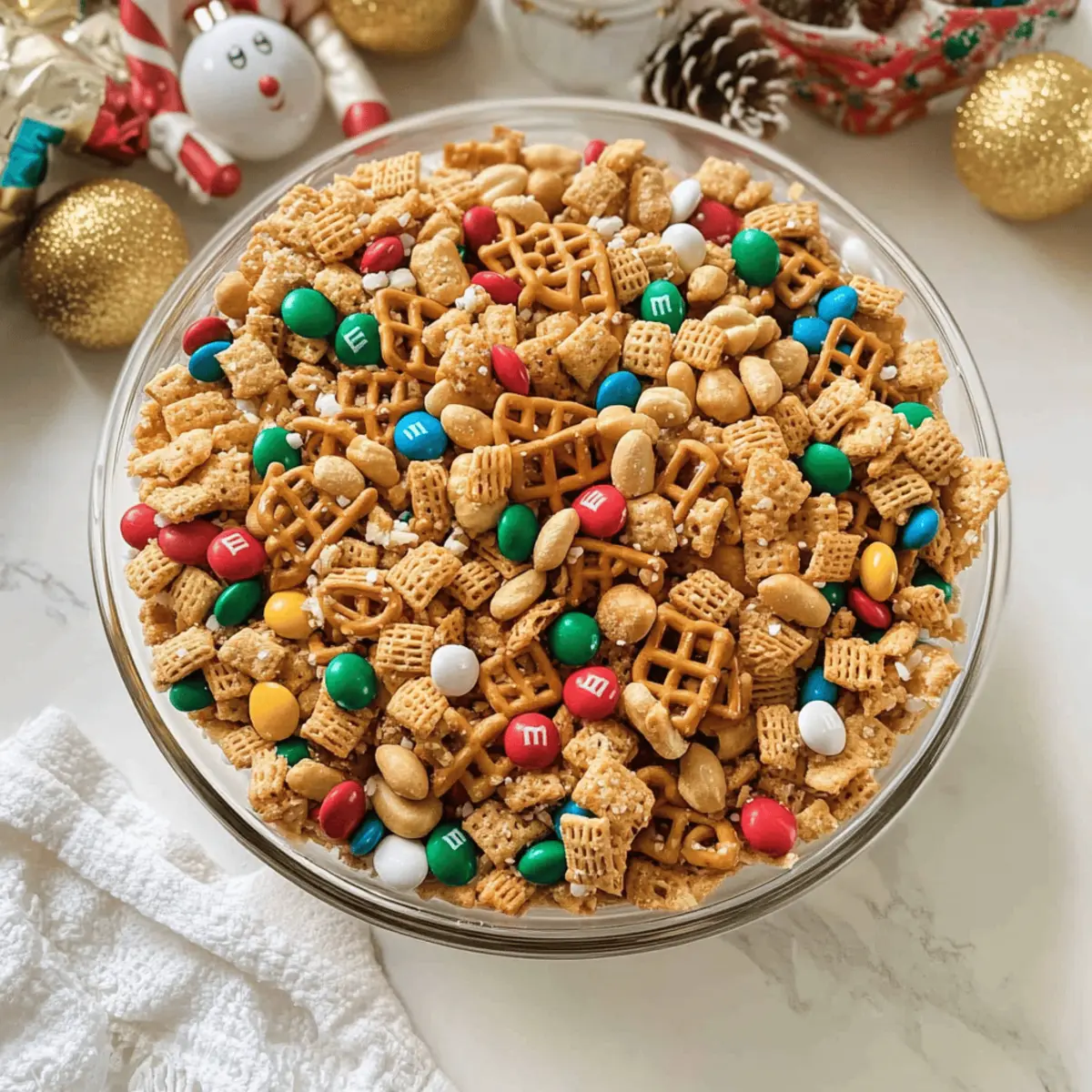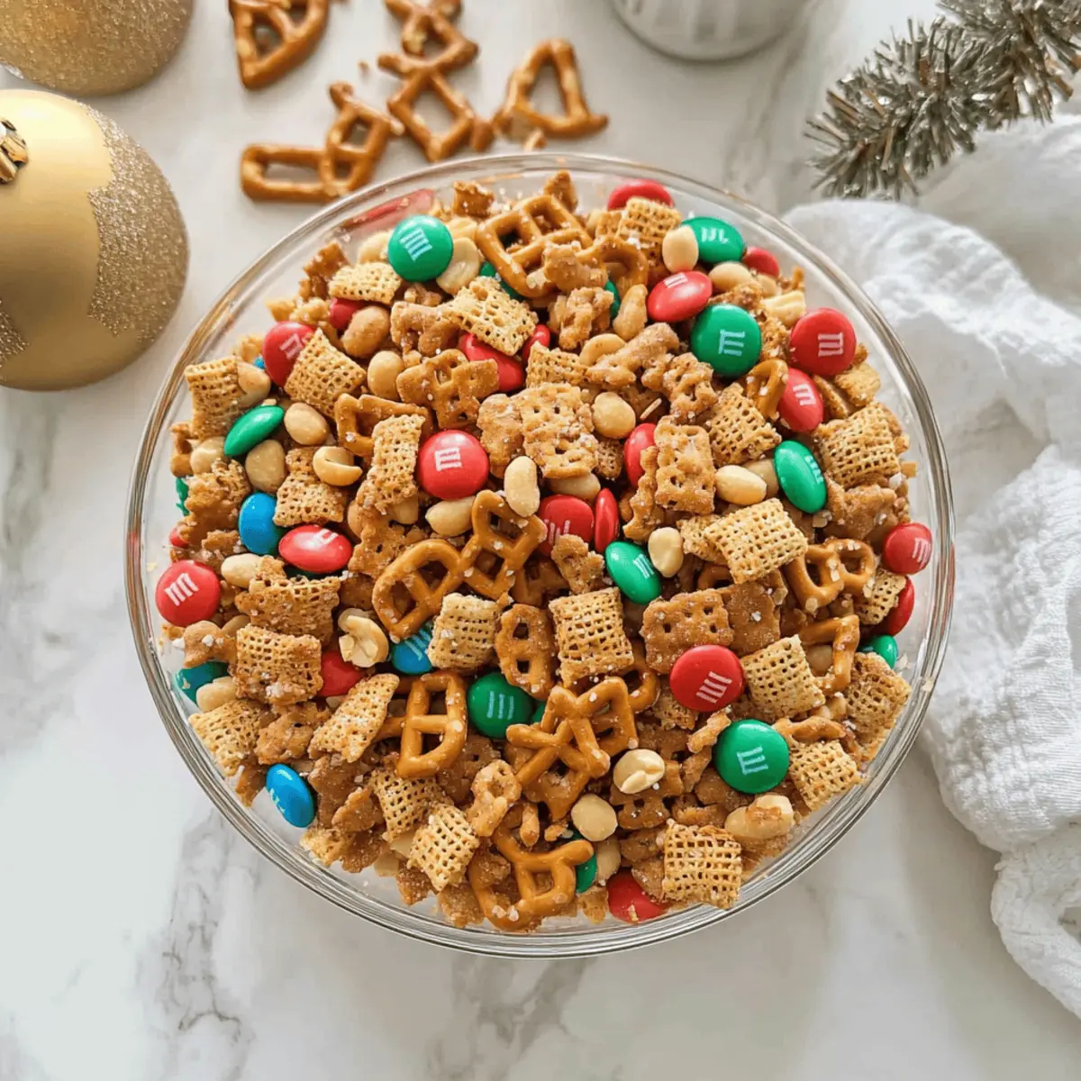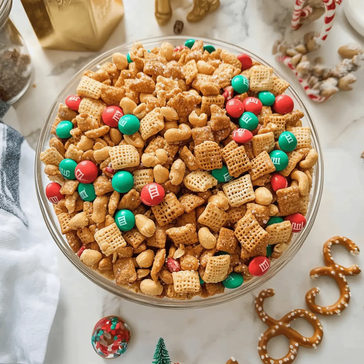 • M&M’s – adds colorful pops of sweetness that elevate the festive flair of your Christmas Crack Chex Mix.