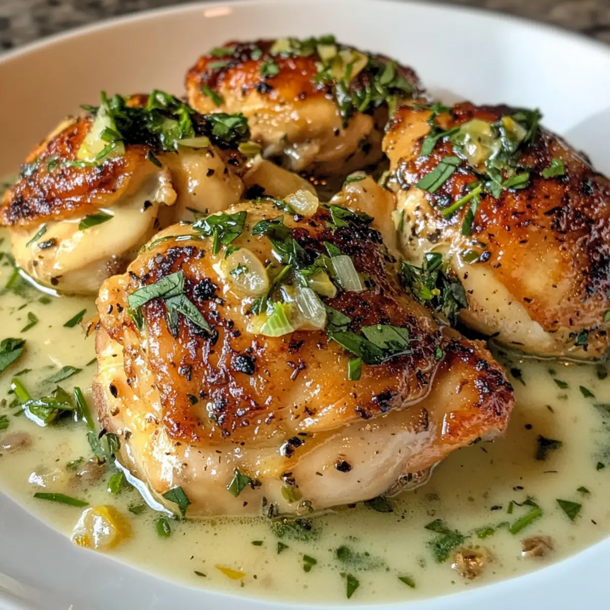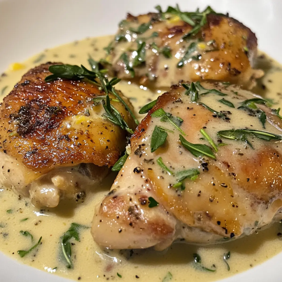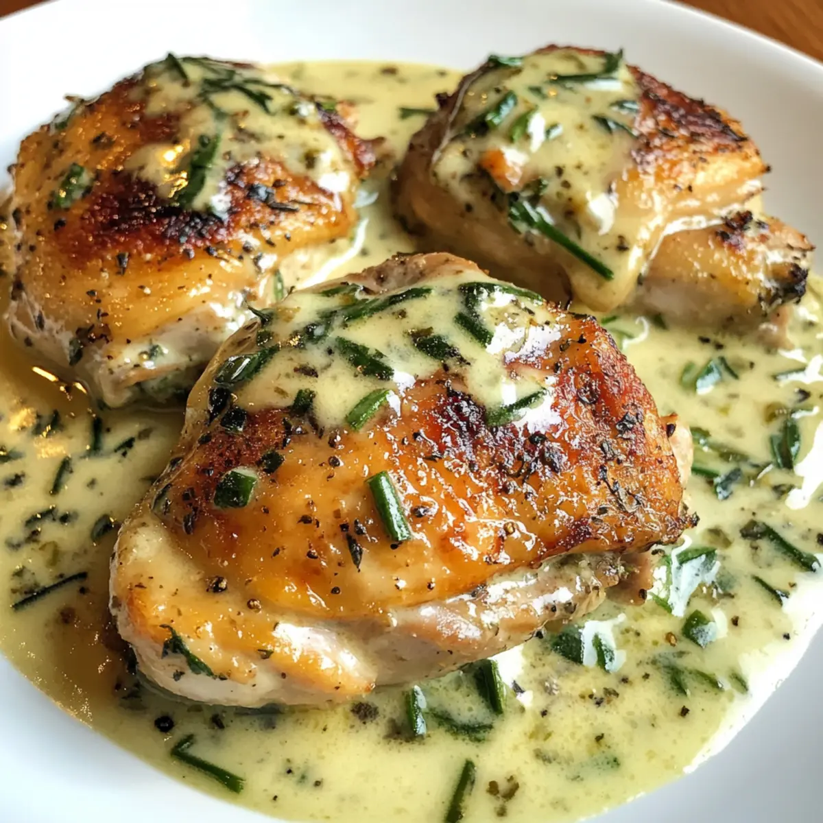 Crispy Perfection: Enjoy crispy chicken thighs that are golden-brown and succulent, paired beautifully with the sauce.