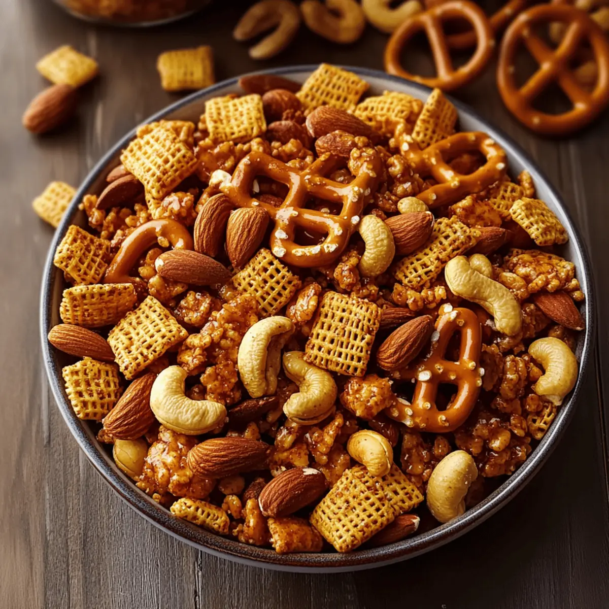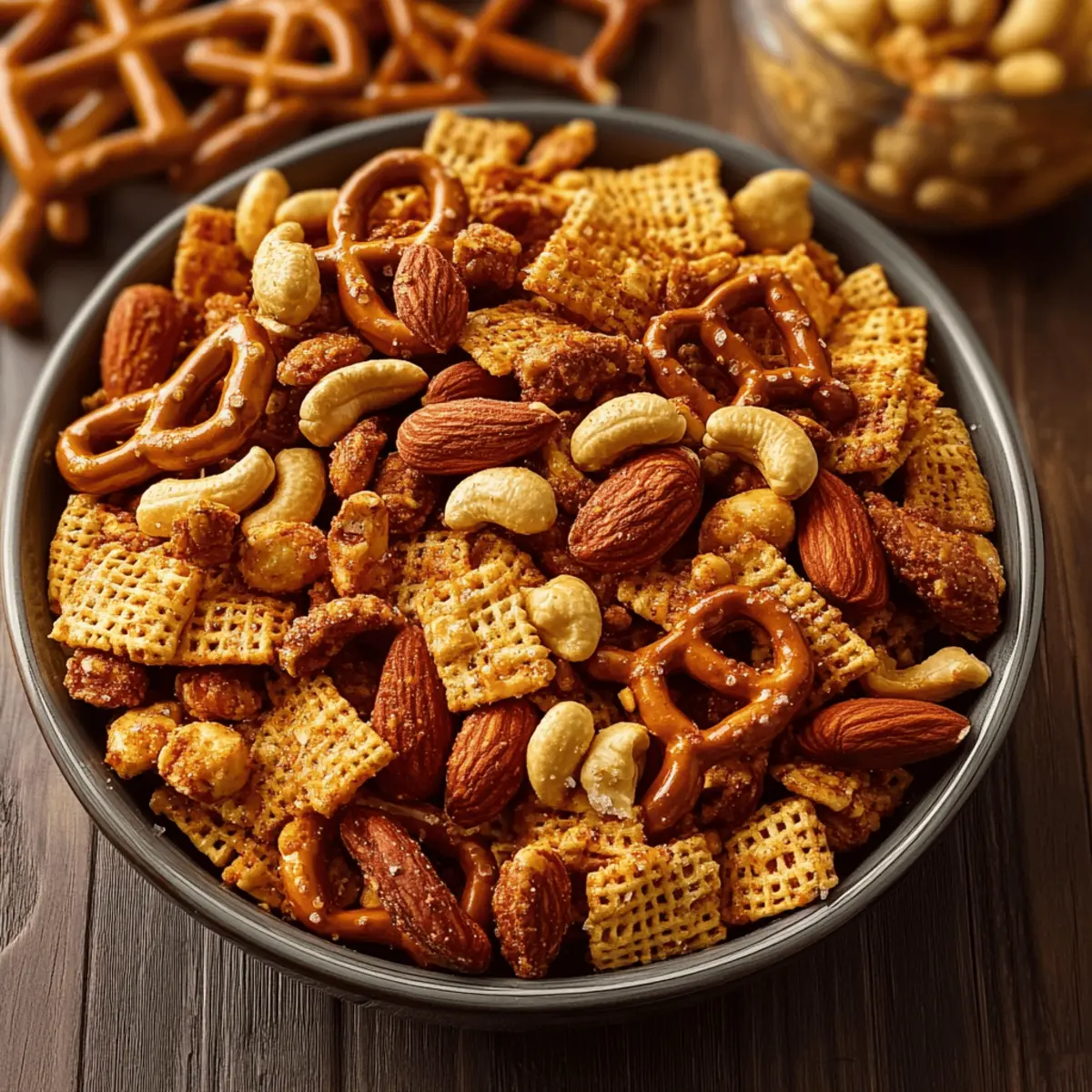 Enjoy whipping up this delightful Crunchy Spicy Nutty Snack Mix, perfect for bringing warmth and flavor to any gathering!