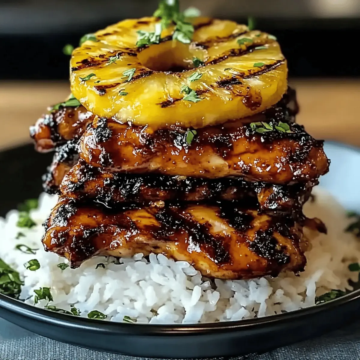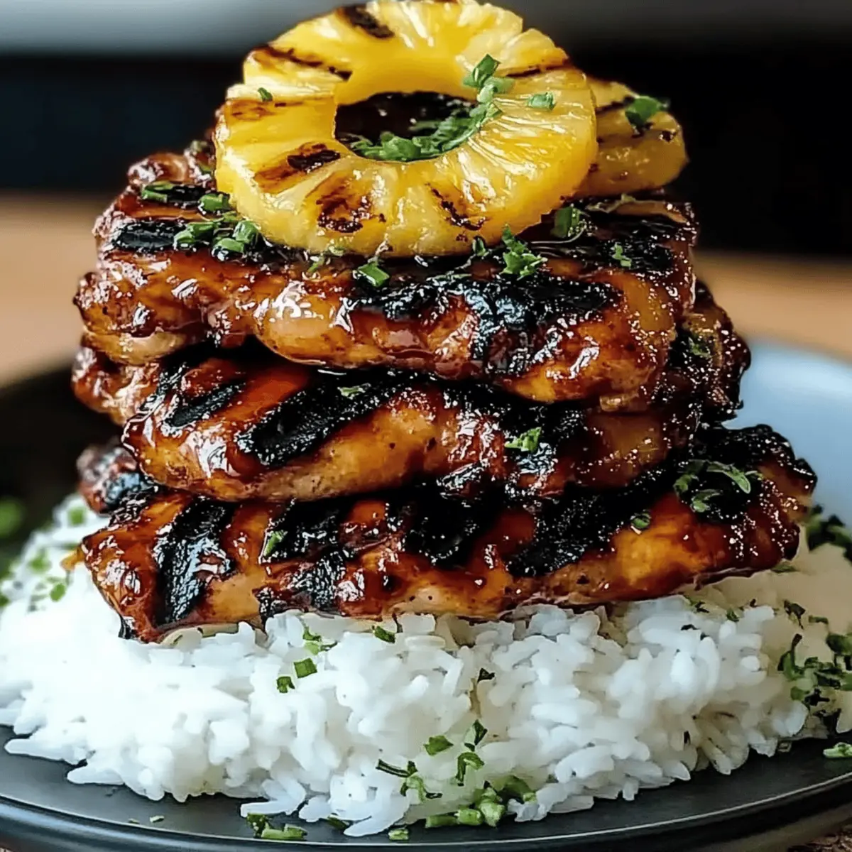 This Hawaiian Huli Huli Chicken Stack features teriyaki-marinated chicken and caramelized pineapple, offering a delightful tropical flavor explosion.