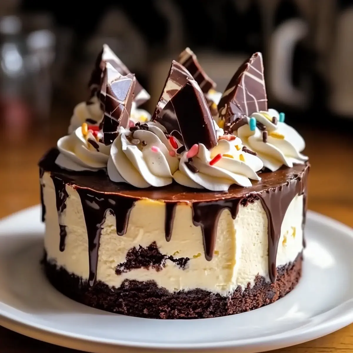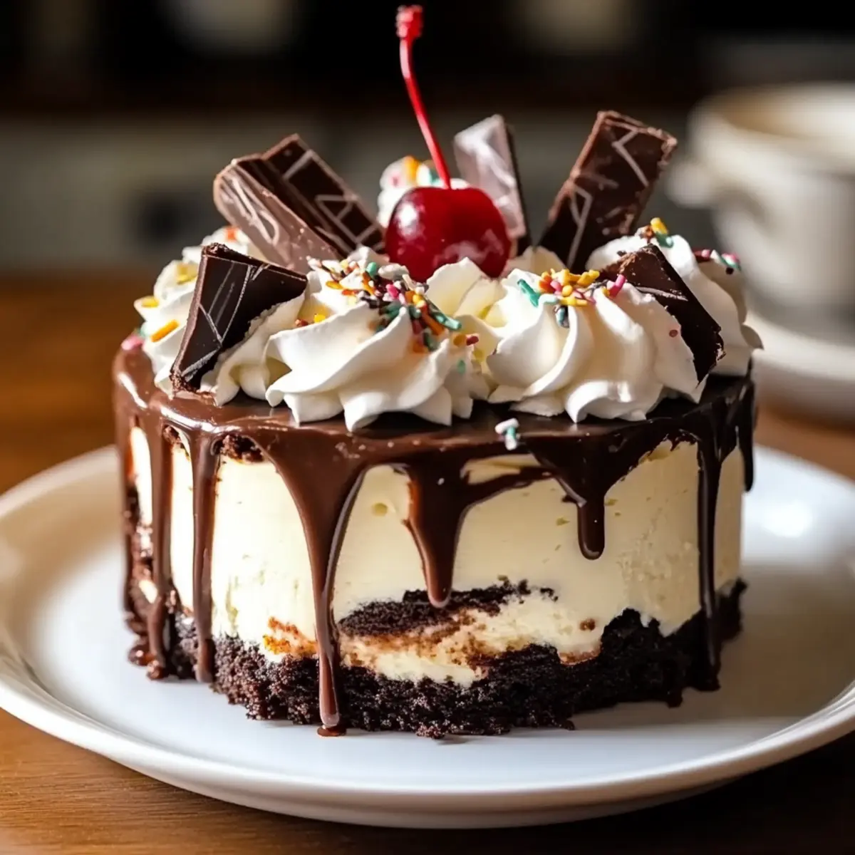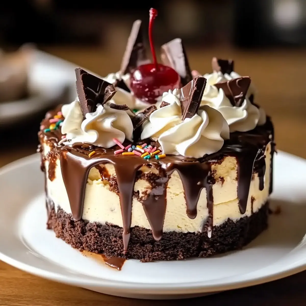 5. Before serving, whip up some heavy cream until peaks form for a light topping. Generously dollop the whipped cream on top of the fudge, then add a sprinkle of colorful sprinkles and a few maraschino cherries for a classic sundae touch. Cut into slices and enjoy this indulgent Hot Fudge Brownie Cheesecake that’s sure to impress friends and family alike!
