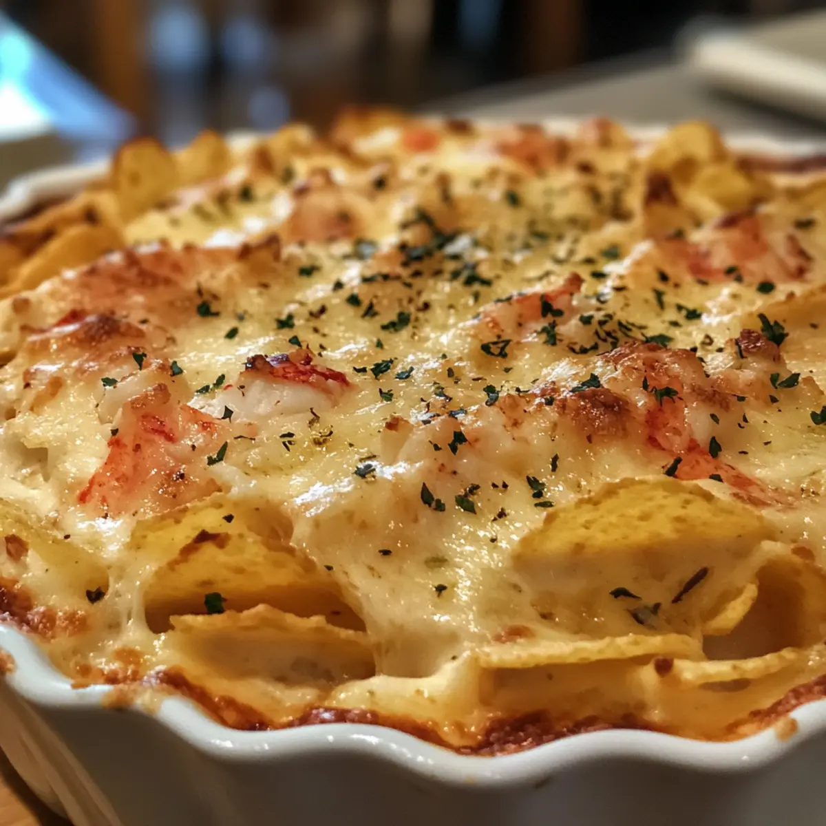 Spread the lobster mixture evenly into a greased baking dish. Make sure it’s distributed smoothly across the bottom, as this helps with even cooking. Once spread out, sprinkle the crushed potato chips generously over the top, adding a crunchy texture that beautifully contrasts with the creamy filling of the dip.