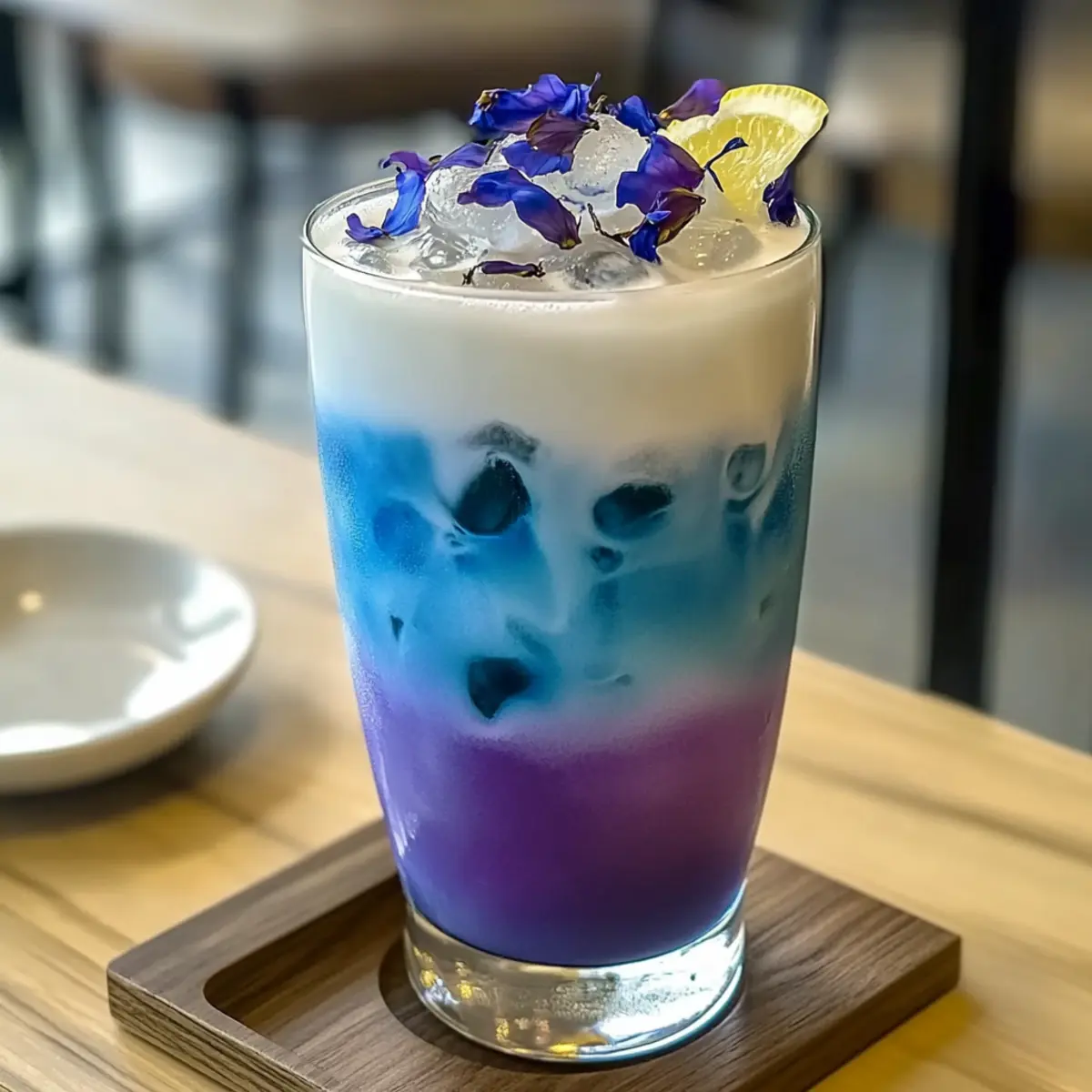 Visually Stunning: The Iced Butterfly Pea Flower Tea Latte captivates with its striking blue color, transforming into a mesmerizing purple with a squeeze of lemon.