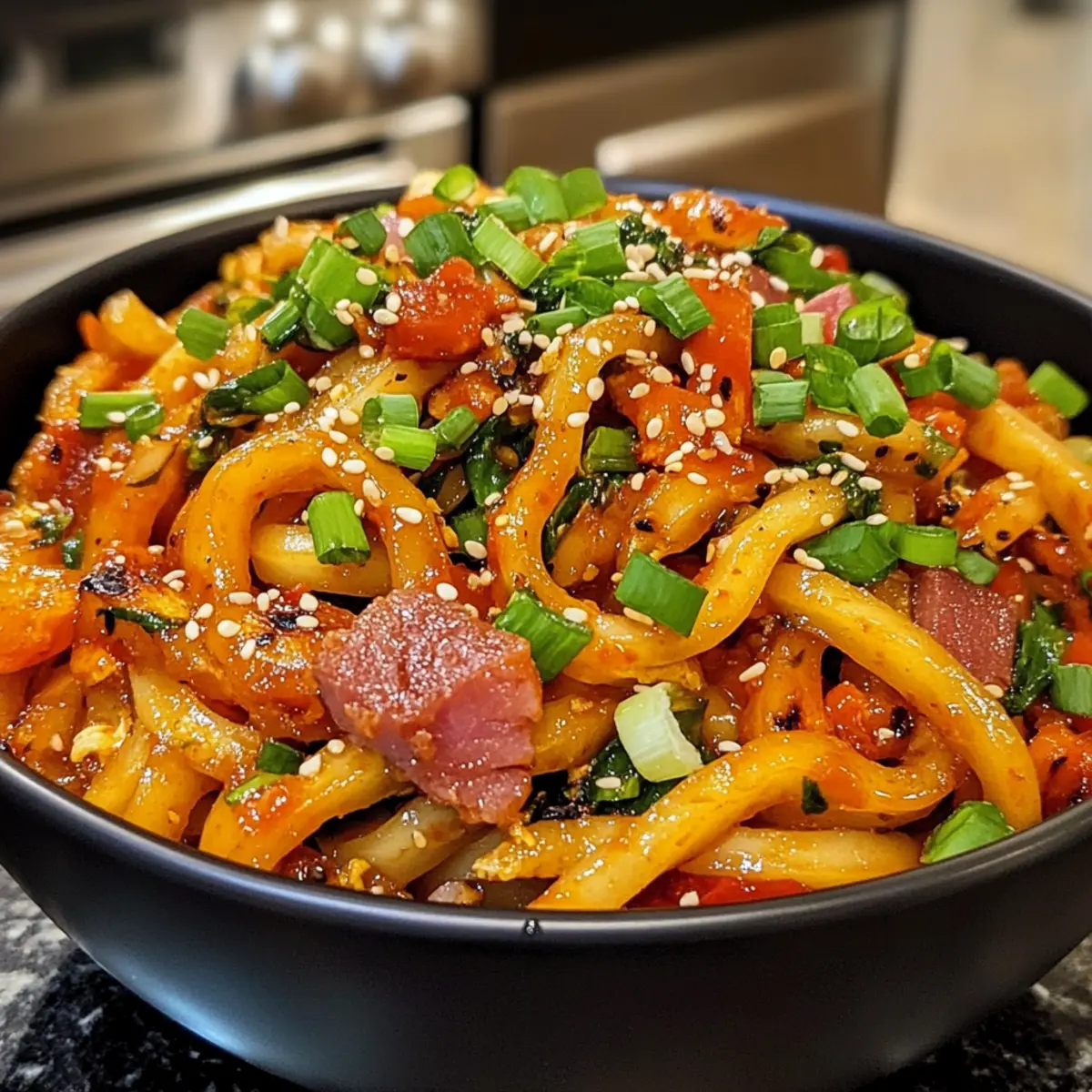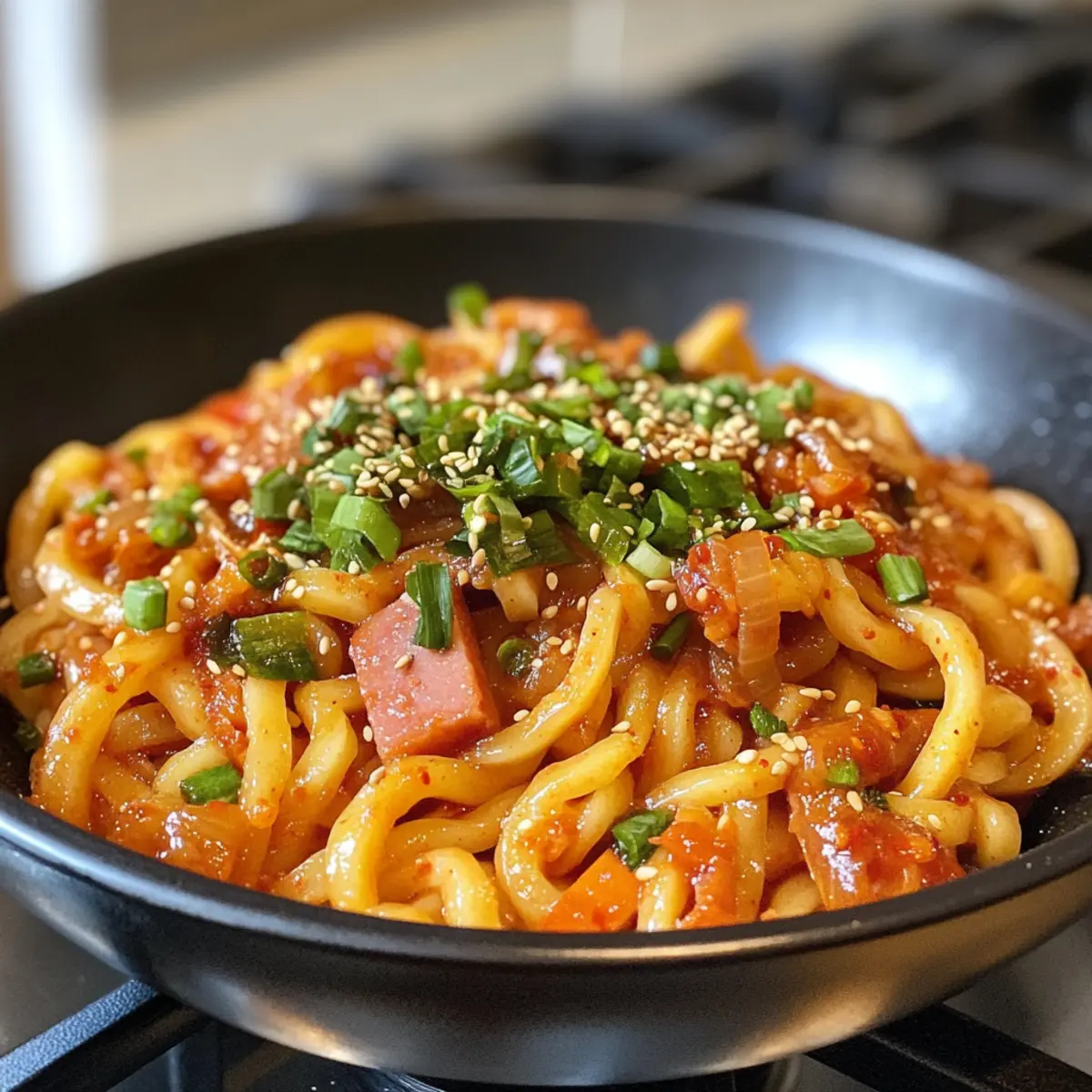 Simplicity at its finest: This Vegan Kimchi Udon Noodle Stir-Fry comes together in just minutes, making it a perfect weeknight meal for those with busy schedules. Flavor-packed and delicious, the spicy kick of kimchi combined with savory soy sauce creates an unforgettable taste that you’ll crave again and again. Versatile like no other, feel free to customize it with your favorite seasonal veggies or a protein boost from vegan ham or tofu. Nutritious too, it’s a delightful way to pack in fiber and plant-based goodness. Better yet, this dish impresses guests effortlessly—sharing comforting Asian flavors has never been easier!