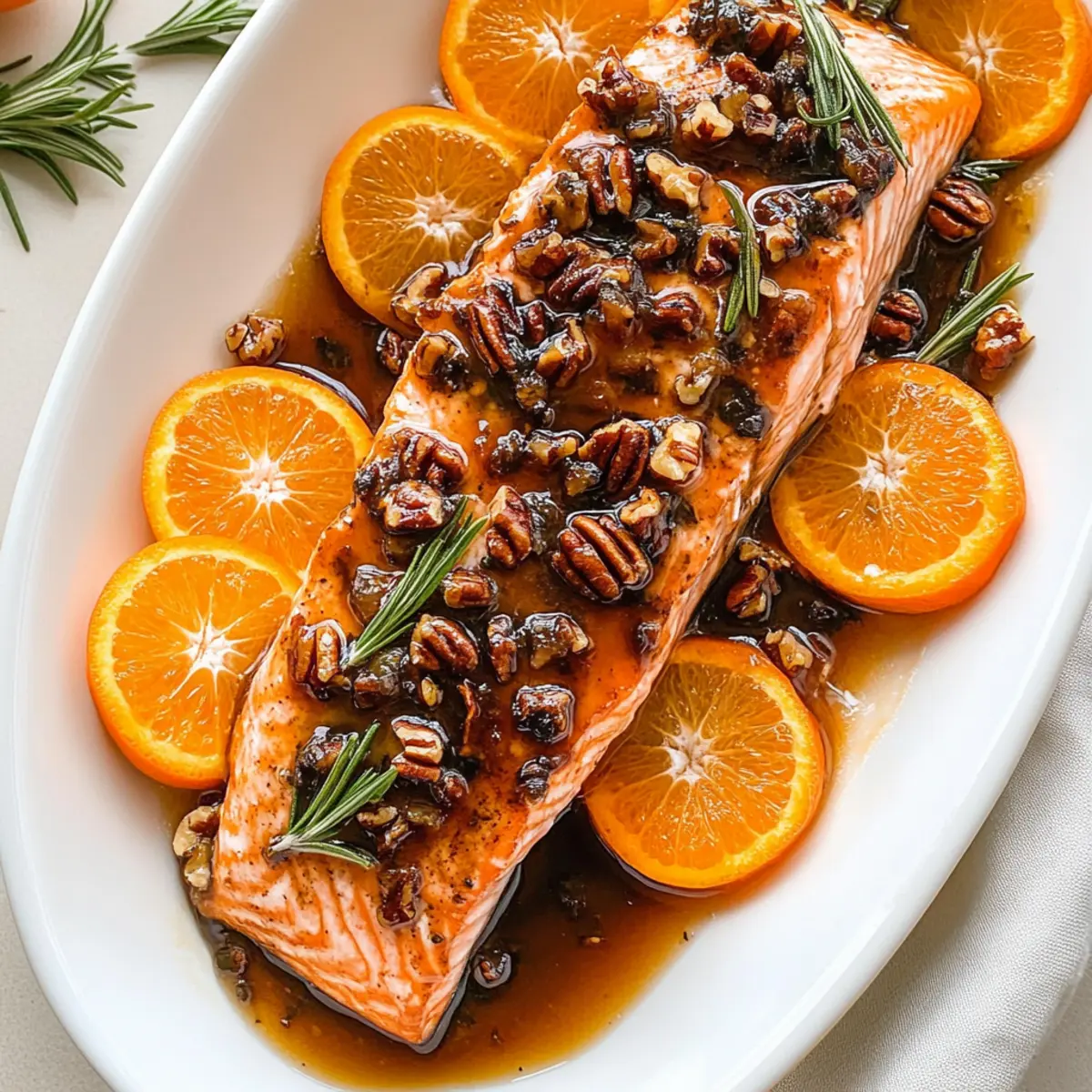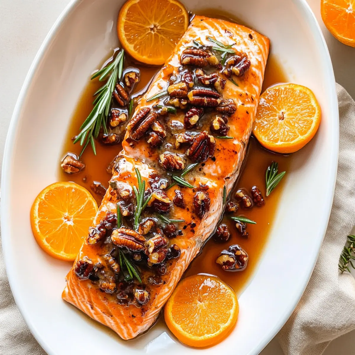 Once the salmon is cooked to perfection, remove it from the oven and immediately pour the warm maple pecan glaze over the fillets. Make sure to coat them well to capture all the flavors. For an extra touch, garnish with fresh rosemary and optional sliced tangerines, adding color and a burst of freshness to your Maple Pecan Glazed Salmon.