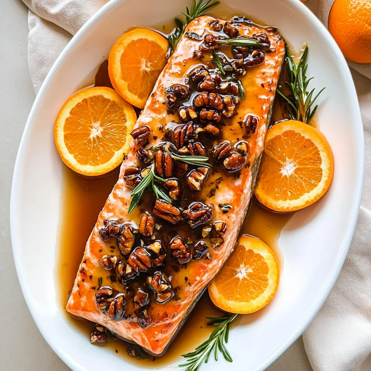 - While the salmon bakes, heat a skillet over medium heat, toast chopped pecans for 3-4 minutes, then add maple syrup, orange juice, kosher salt, and Dijon mustard, simmering for about 5 minutes.