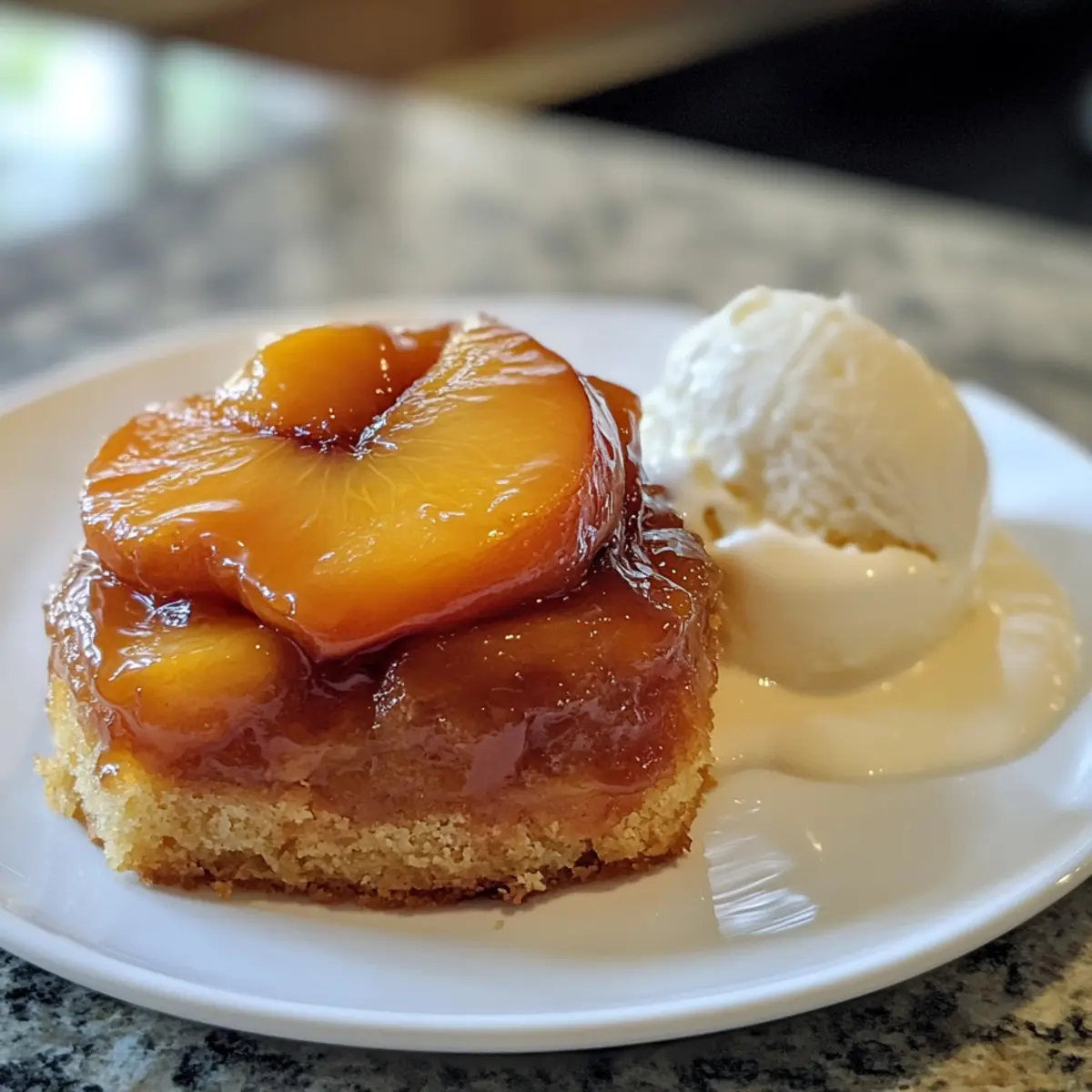 Relish each bite as the creamy ice cream melts into the tender peach topping, creating a heavenly union of temperatures and textures. -