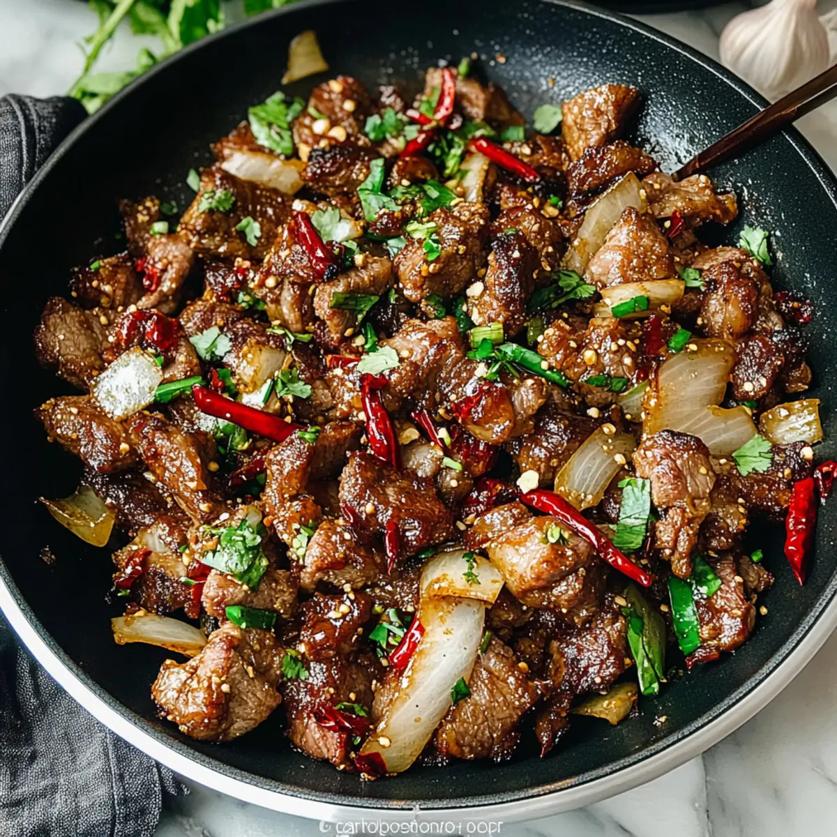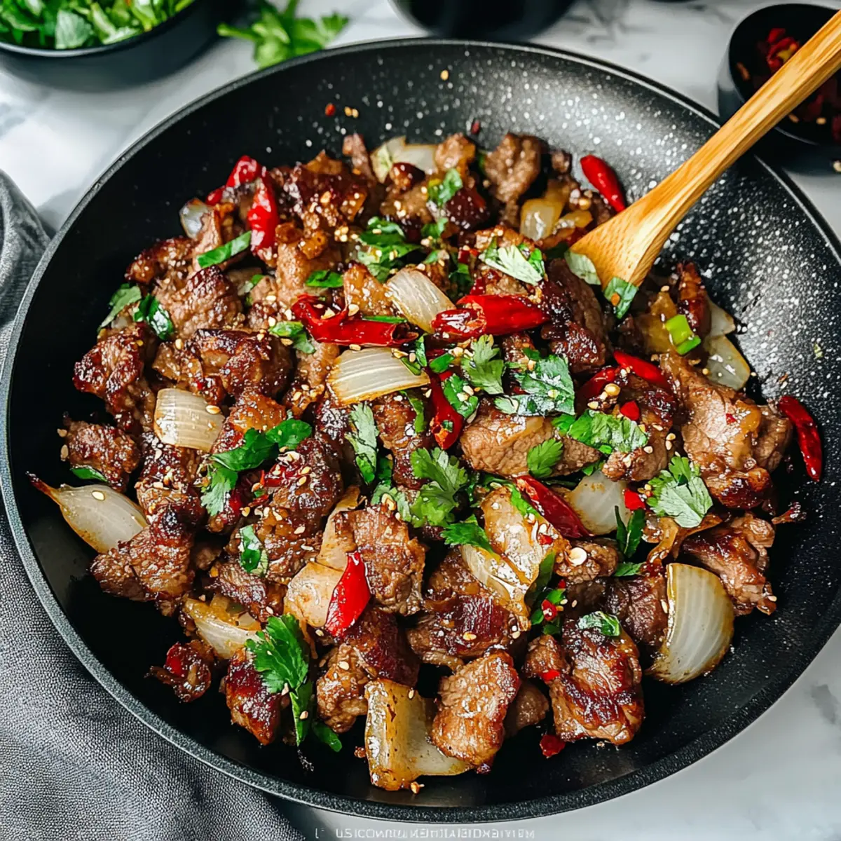 Remove the skillet from heat and add in chopped cilantro, giving it a final stir to incorporate the fresh herbs throughout the dish. This step not only enhances the flavor but also adds a vibrant touch, completing your Real-Deal Xinjiang Cumin Lamb. Serve immediately for the best experience!