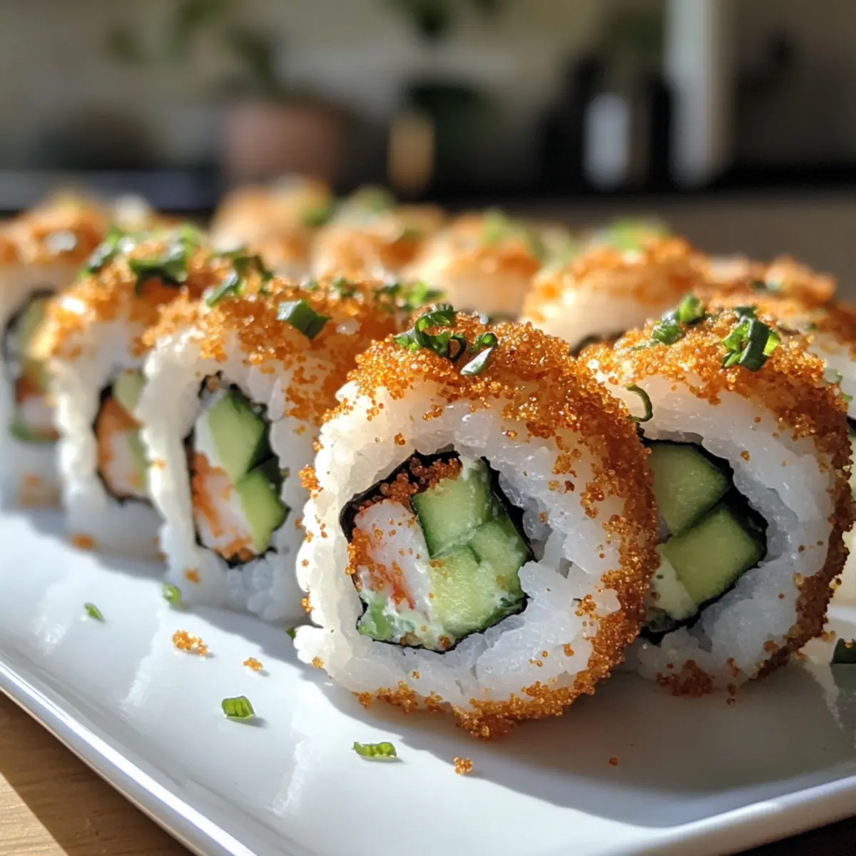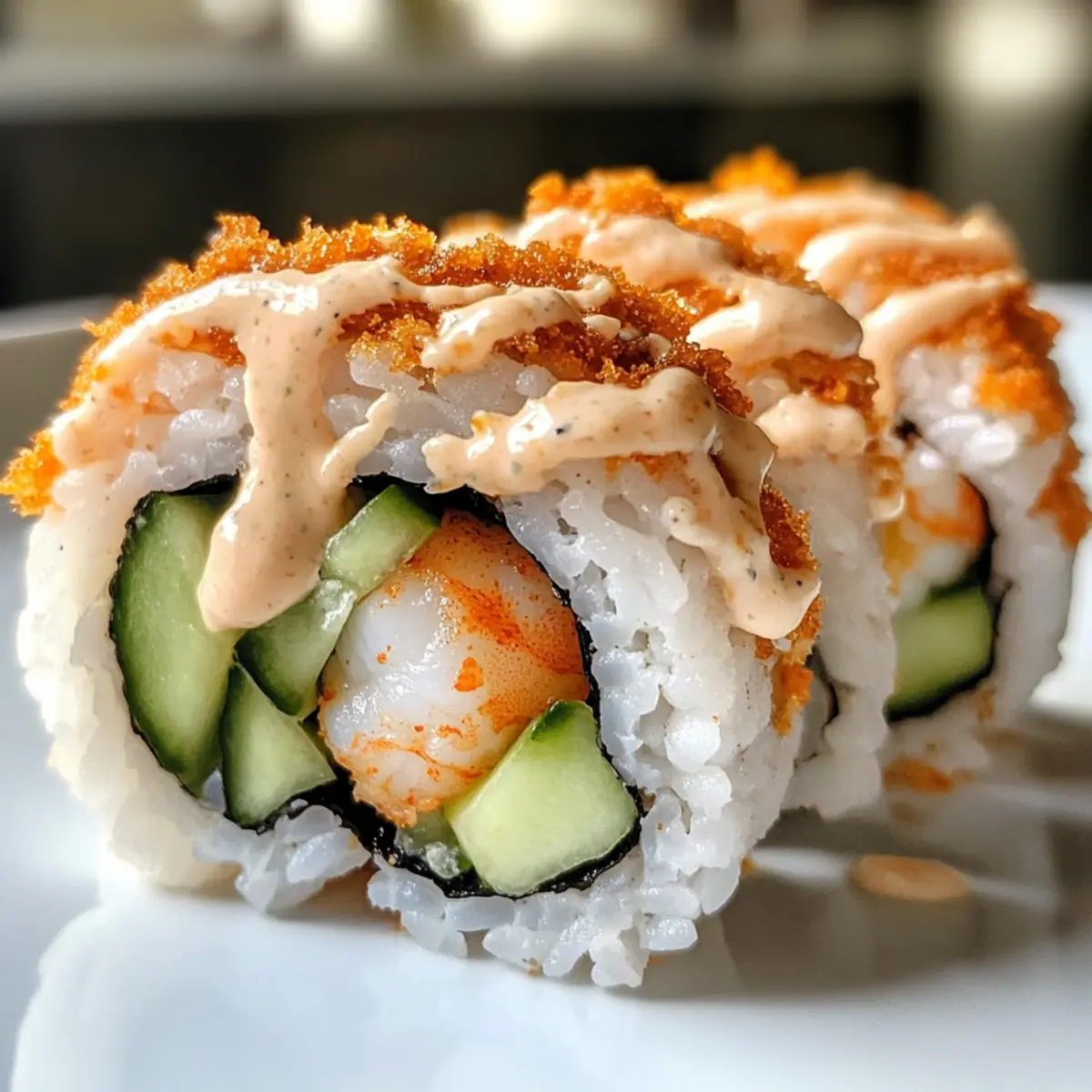 Arrange the sliced shrimp tempura rolls on a serving plate, then drizzle with spicy mayo and sprinkle with sesame seeds for an elegant finish. Serve alongside soy sauce for dipping and pickled ginger to cleanse the palate between bites; your delicious crispy shrimp tempura rolls are now ready to impress!