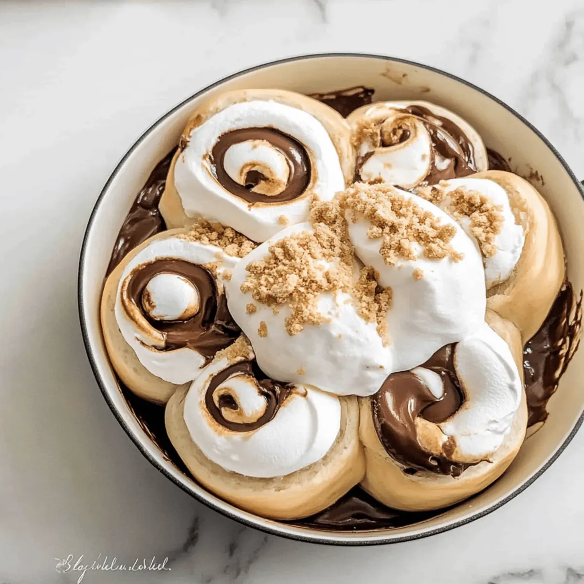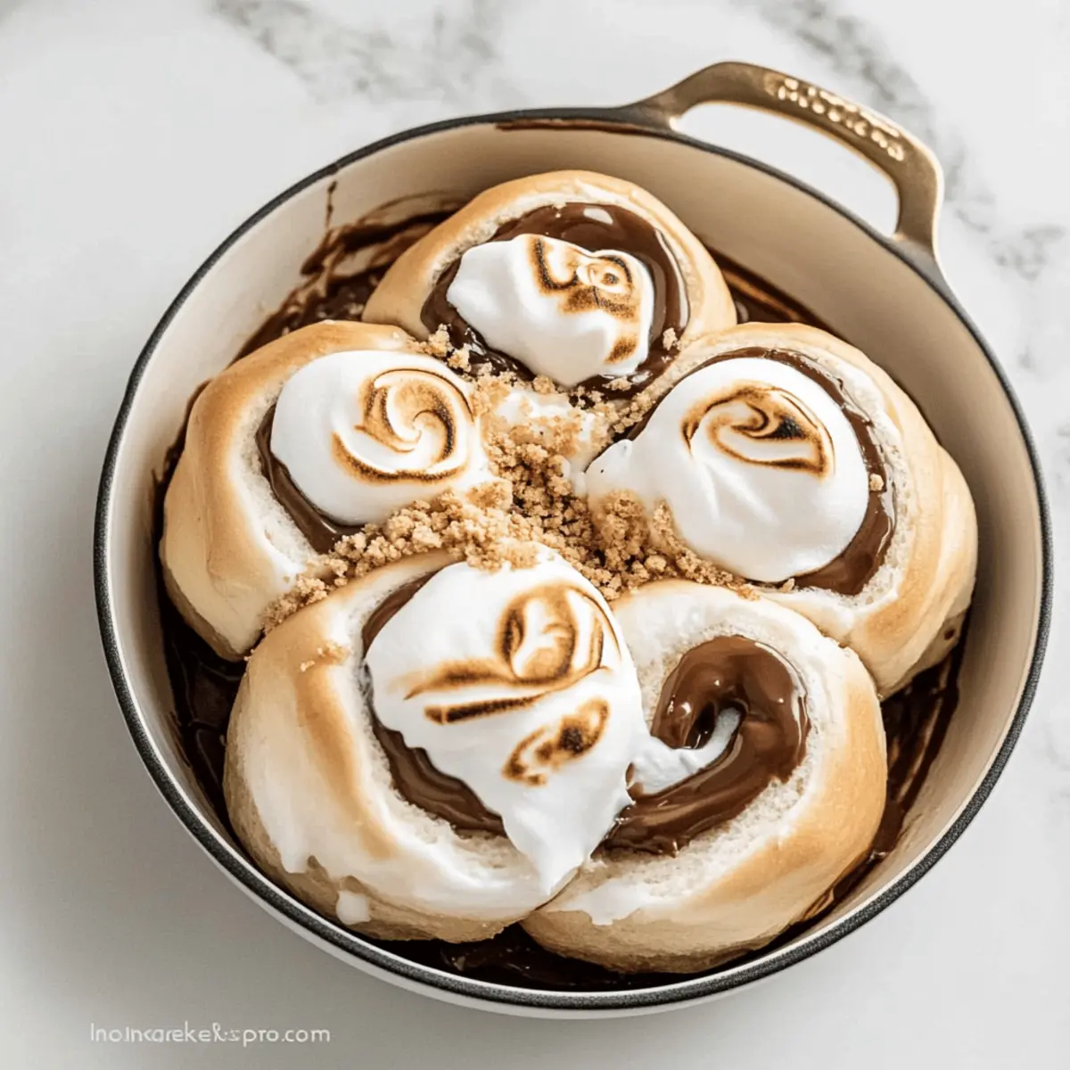 Carefully spread the fluffy meringue on top of the baked S’mores Rolls, covering them fully. Use a kitchen torch or broiler to lightly toast the meringue until golden brown, monitoring closely to prevent burning. The final result will be beautifully toasted S’mores Rolls with a gooey chocolate filling and a fluffy, decadent meringue topping that’s absolutely irresistible.
