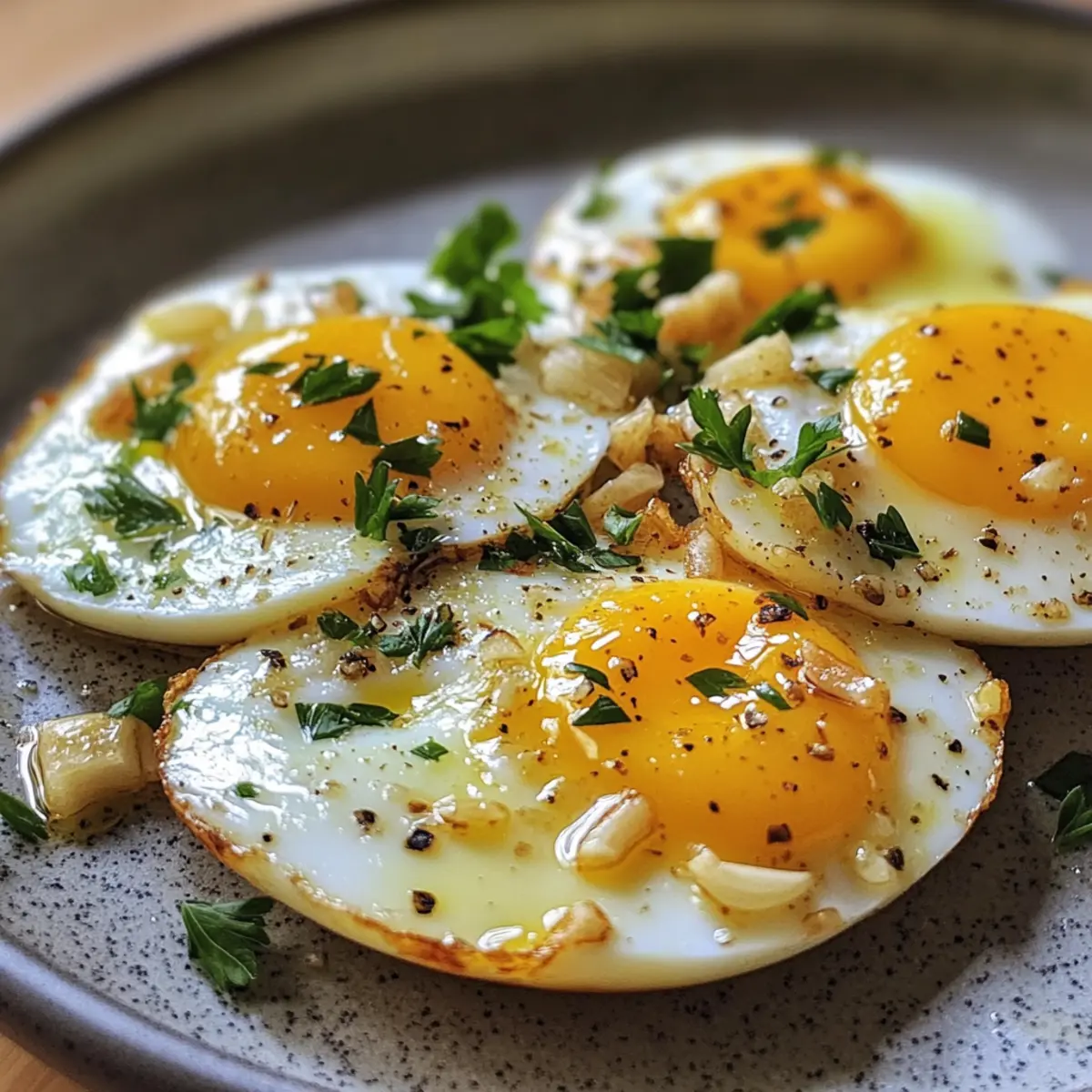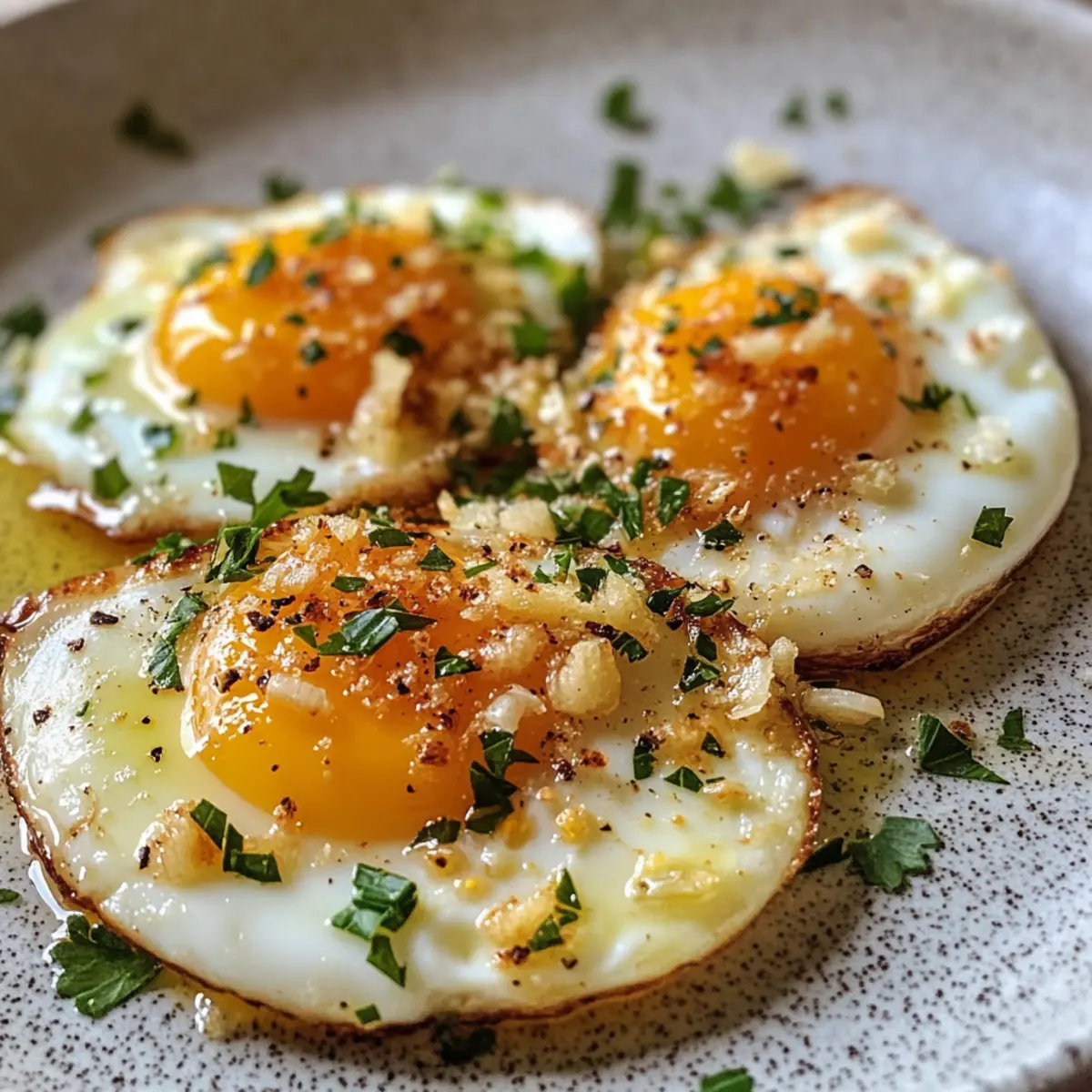 - Add the Eggs: Crack eggs into separate bowls, carefully slide into the hot oil, and baste with the garlic oil.