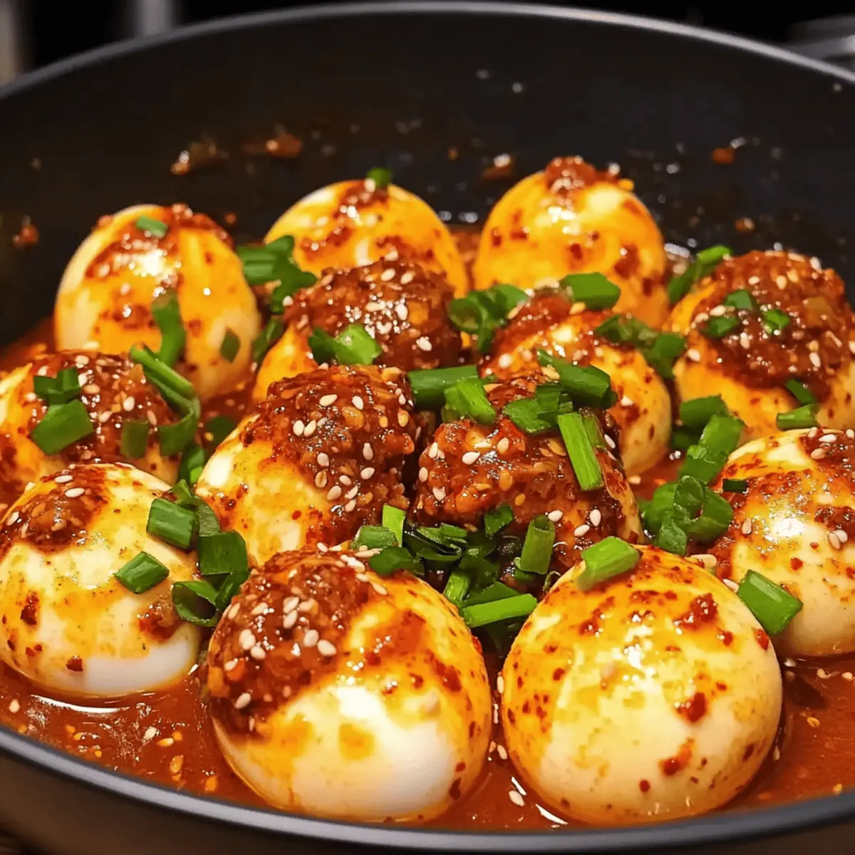 Carefully peel the boiled eggs and gently add them to the skillet, spooning the rich sauce over the eggs to coat them evenly. Let the eggs heat through for about 2 minutes, ensuring they absorb the wonderful flavors of the gochujang sauce. This enriches the dish with warmth and spice.