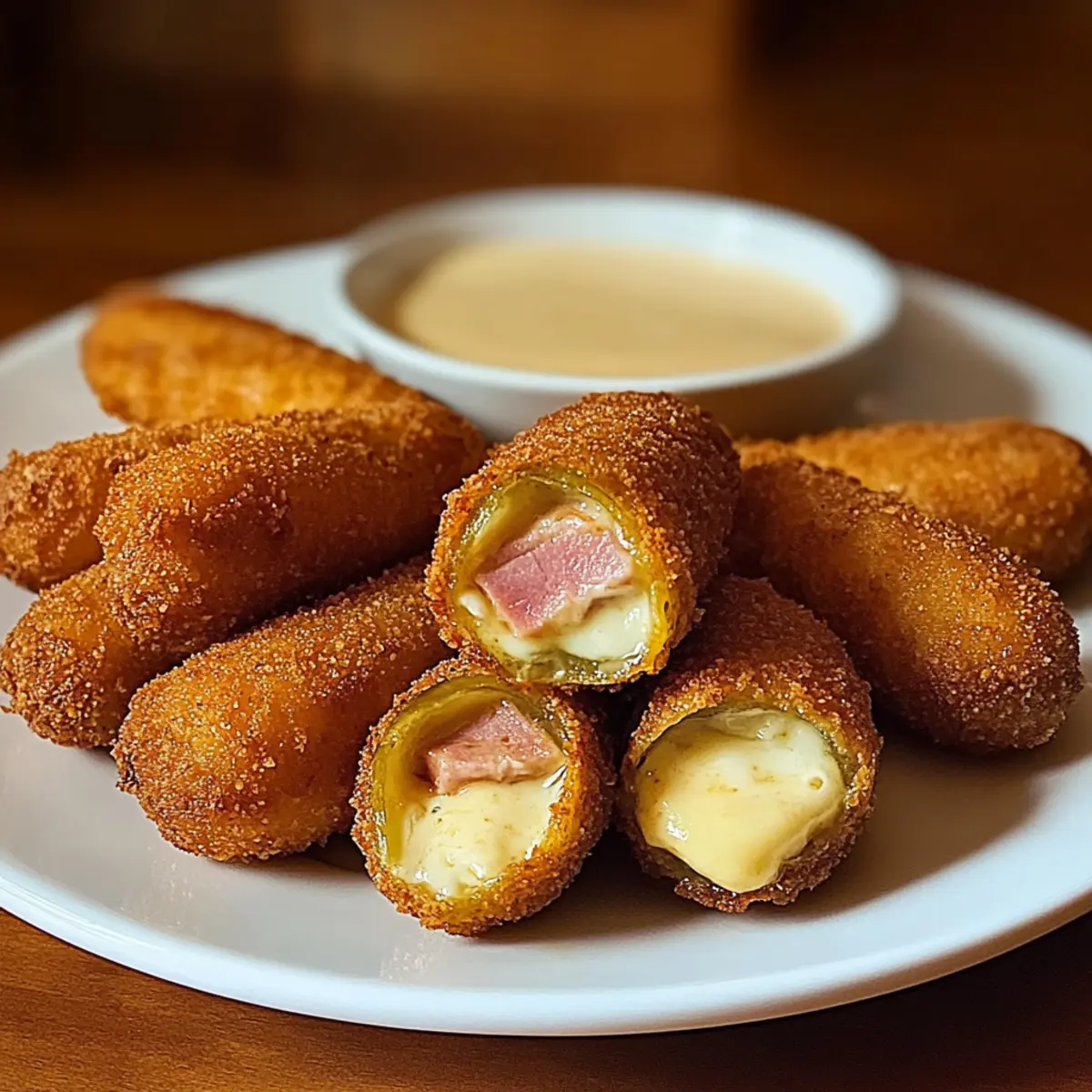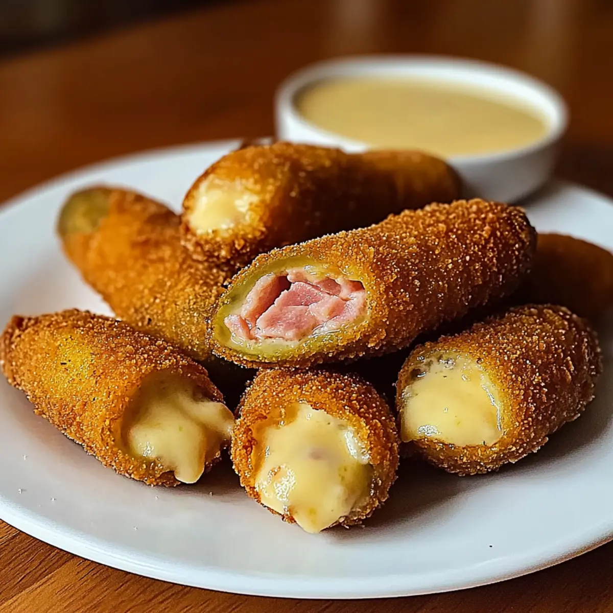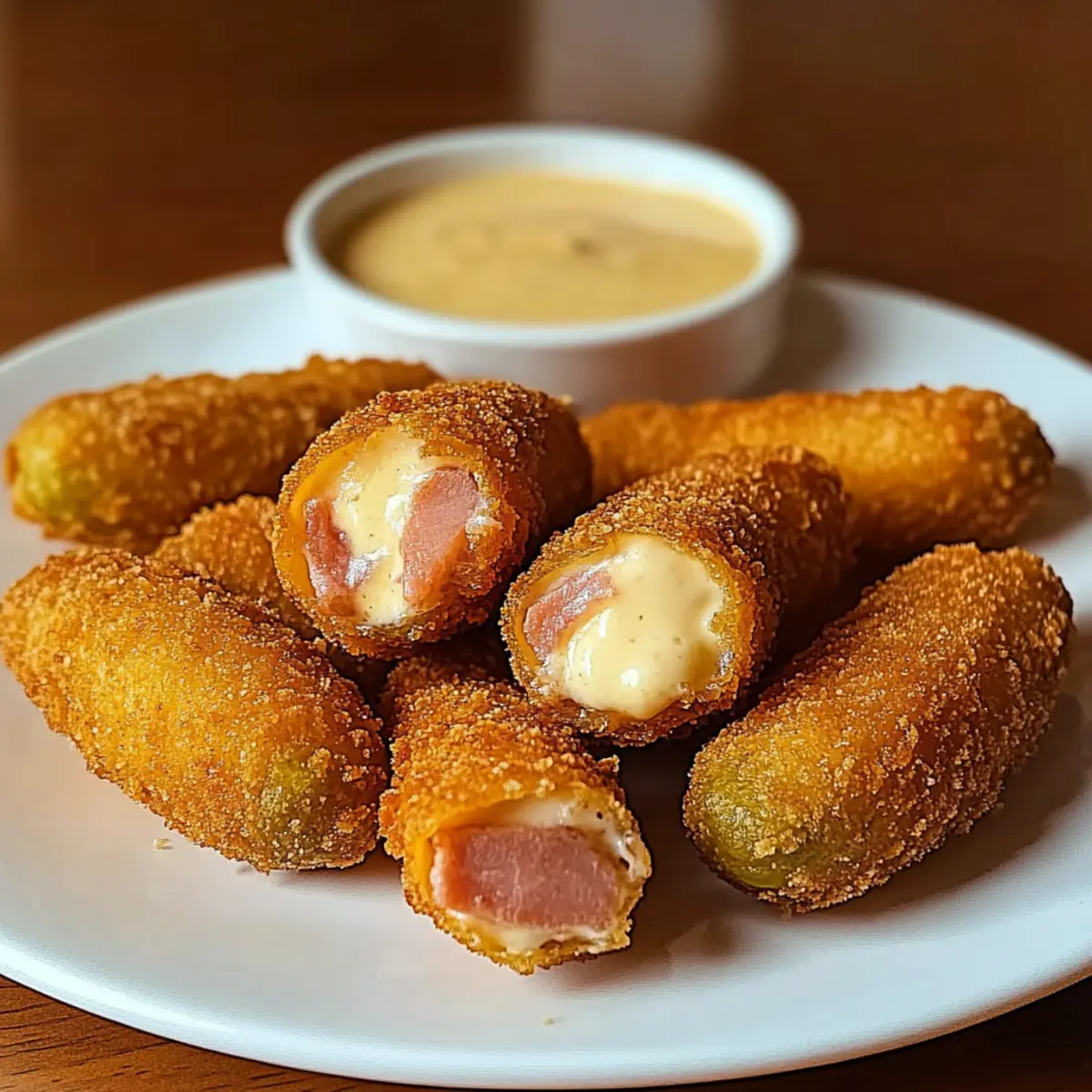 Indulge in crispy stuffed fried pickles, filled with creamy mozzarella and savory ham. Perfect for game day.