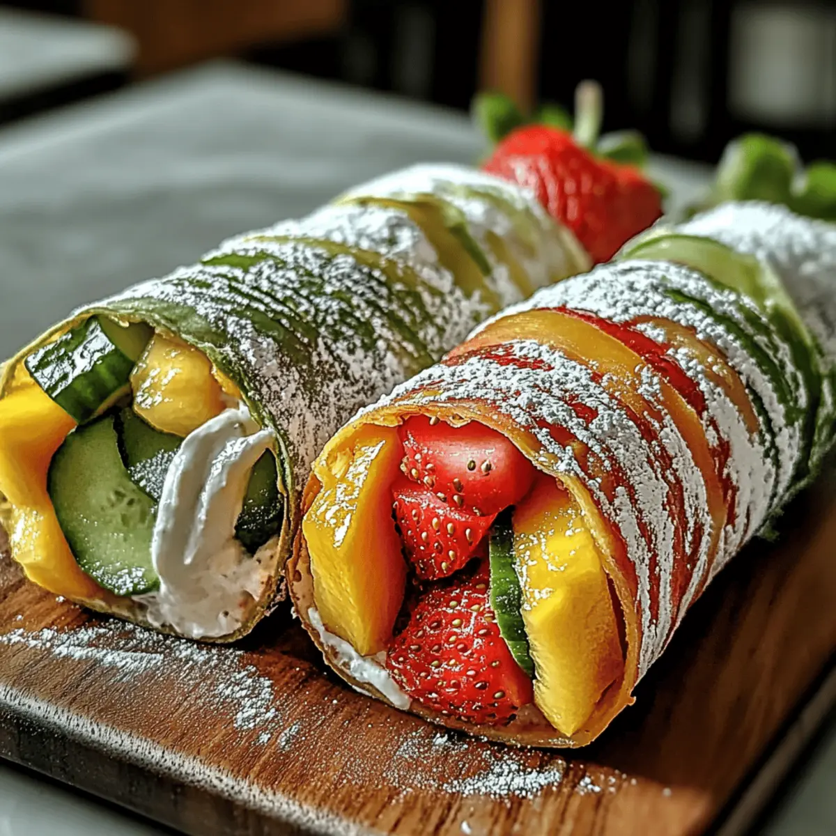 - Assemble Wraps: Lay a tortilla flat, spread the cream cheese mixture evenly, and layer the sliced fruits and cucumber.