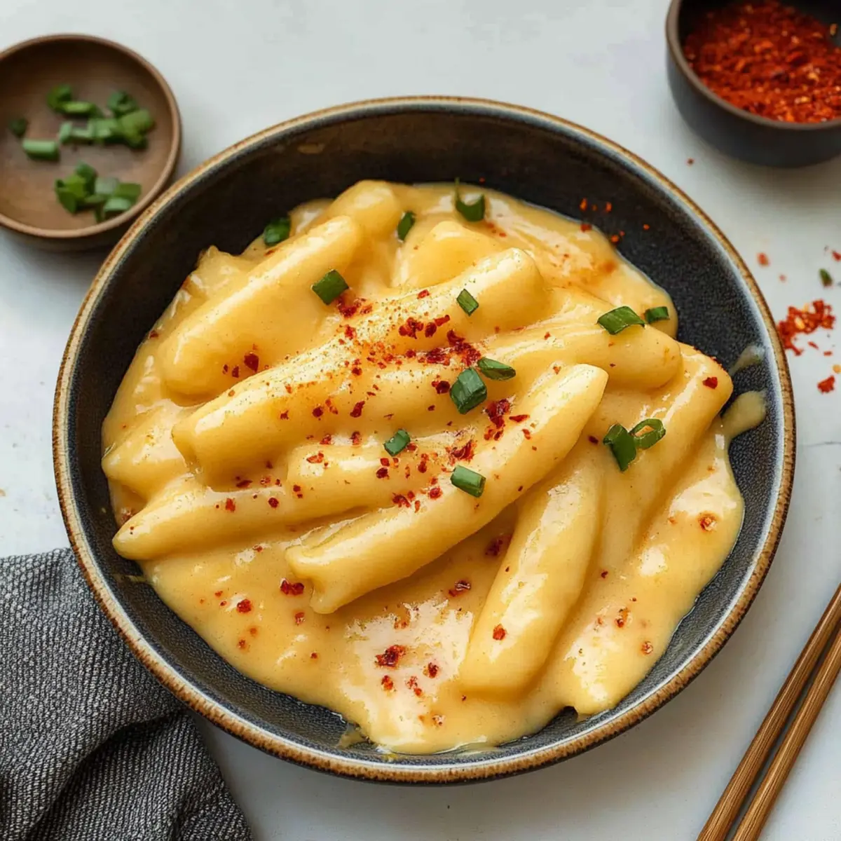Comforting and Satisfying: This dish offers the best of both worlds—a creamy cheese sauce that envelops chewy rice cakes, perfect for those cozy nights in.