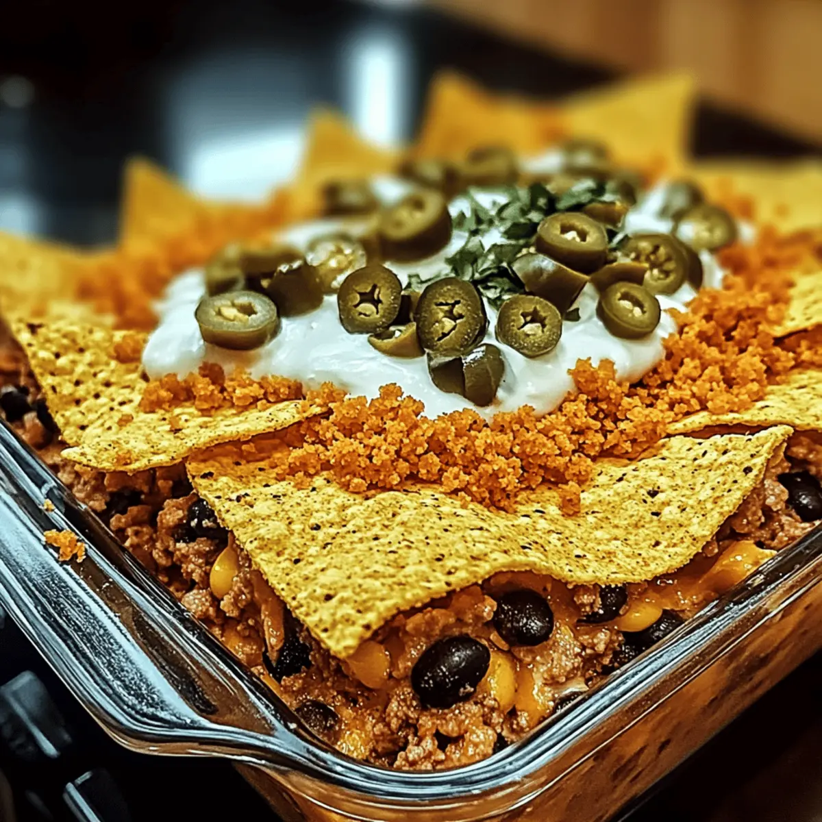 In the prepared baking dish, layer half of the beef mixture first, followed by half of the creamy layer, a cup of shredded cheese, and half of the crushed Doritos. This layering technique ensures that every bite has the delightful crunch of Doritos and the warmth of the casserole.